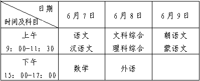 文史类考生考:语文、数学(文)、外语、文科综合;理工类考生考:语文、数学(理)、外语、理科综合;汉语文、朝(蒙)语文仅由中学用本民族语言授课考生参加考试。