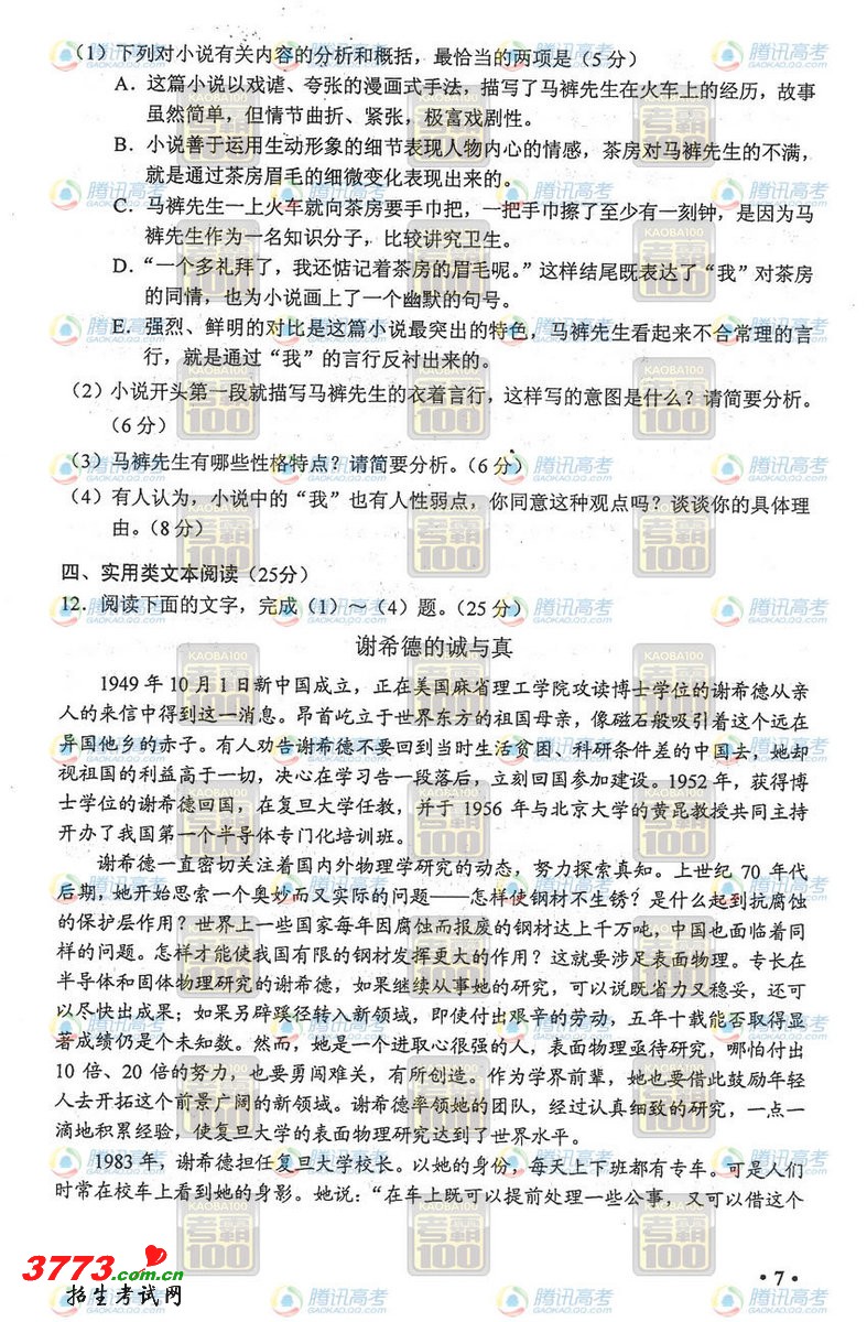 2012年黑龙江高考语文试卷答案(新课标全国卷)