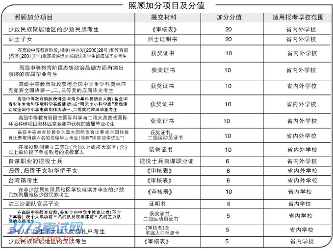 2014年起实施调整后的照顾加分政策共17项。取消了“获省级奥林匹克一等奖”“获省级优秀学生干部”、“获国家艺优生”及“省级艺优生”等4个项目加分;调整了“省级体优生”和“少数民族聚居地区汉族考生”的加分条件,扩大了省属学校毕业的少数民族考生范围。