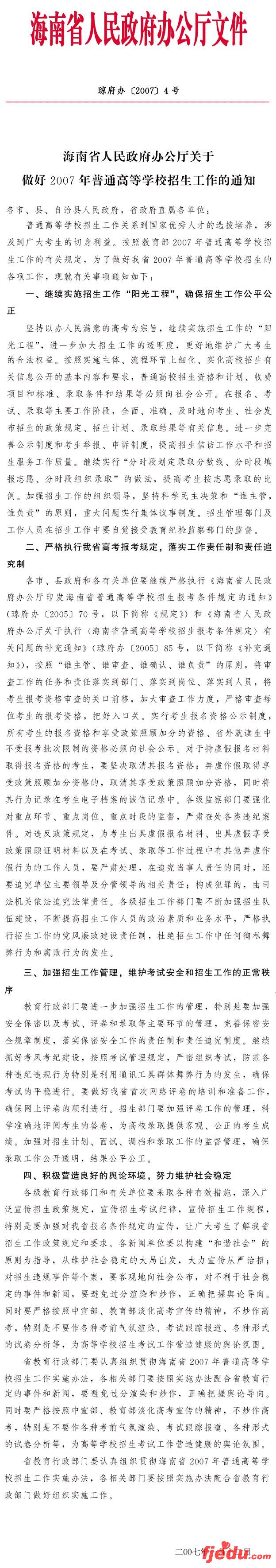 海南省人民政府办公厅关于做好2007年普通高等学校招生工作的通知