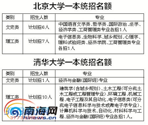 南国都市报6月17日讯(记者许欣)北京大学、清华大学等名校招生信息一向深受考生及家长关注。据了解,今年北京大学在本科第一批向海南投放13个统招计划,清华大学在本科第一批向海南投放11个统招计划,以上计划不含上述学校面向本省贫困地区投放的定向计划以及自主招生人选。