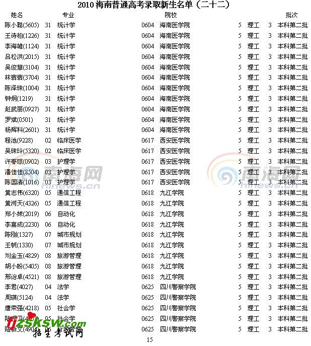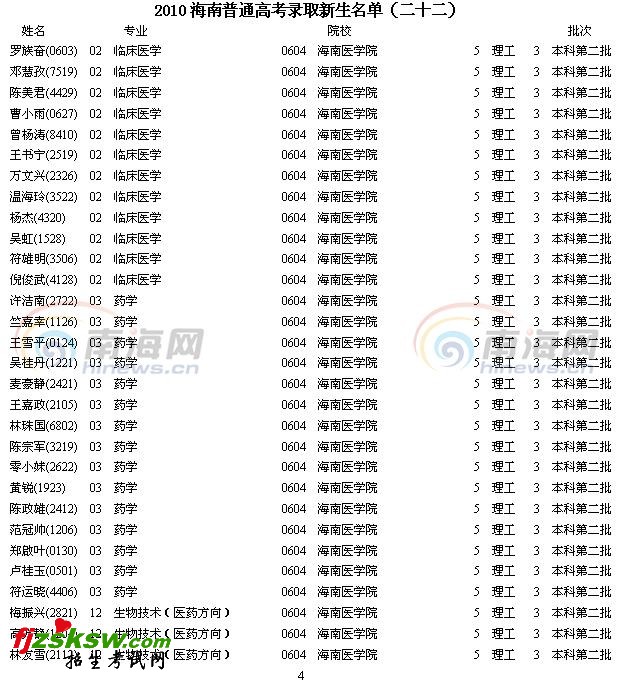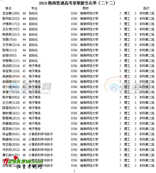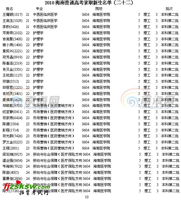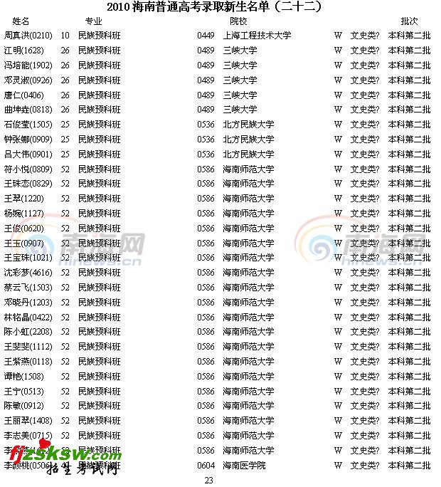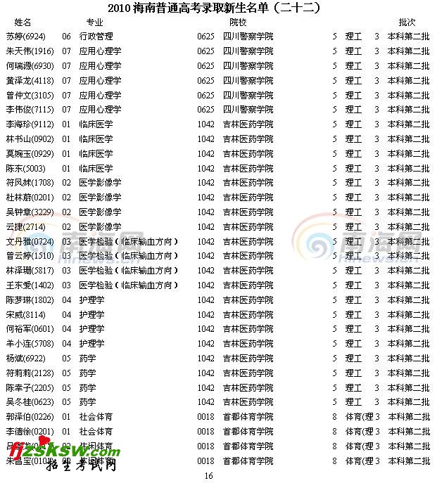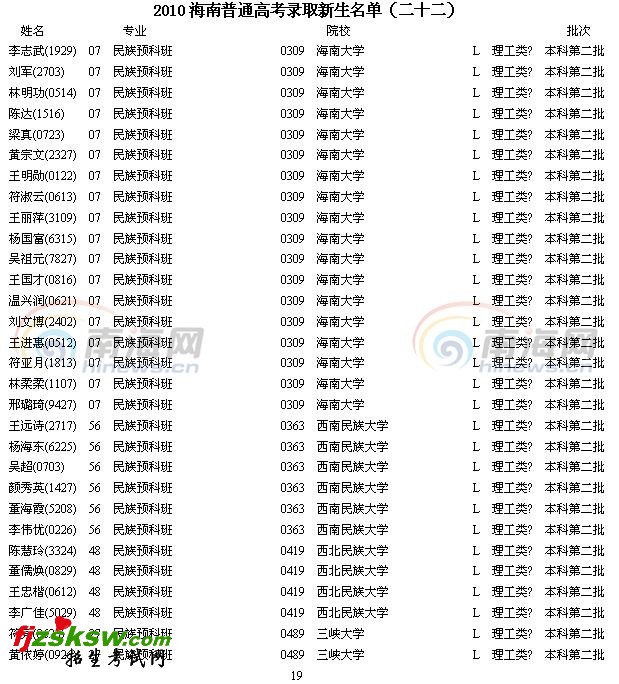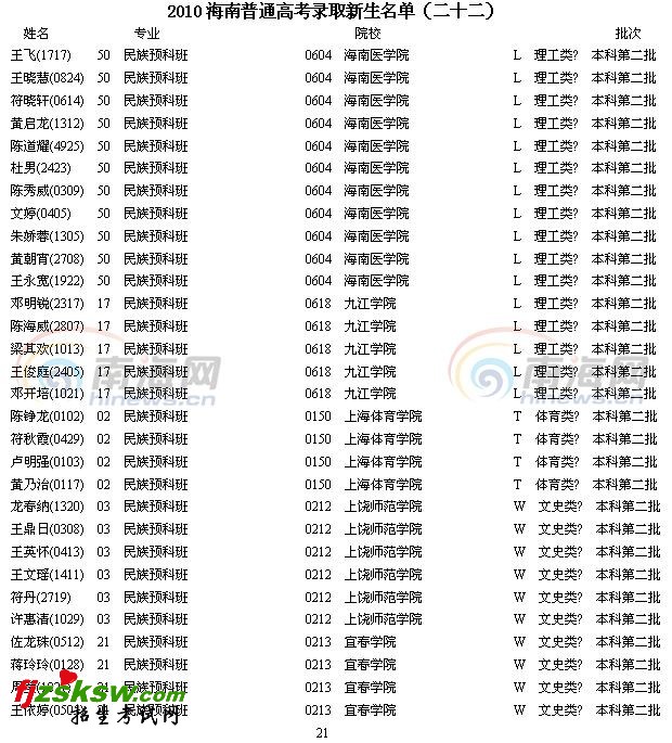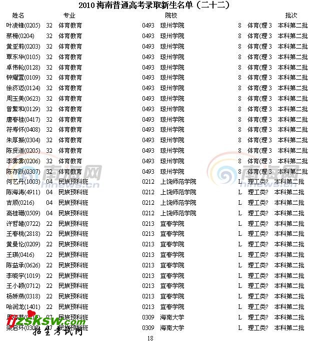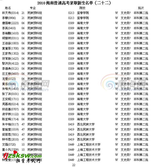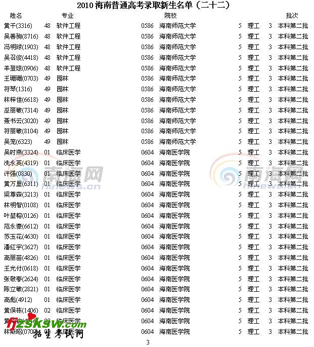 2010年海南省高考录取名单已经开始由海南省考试局陆续公布,今天公布的是2010年海南省普通高考录取新生名单(二十二)详情请点进南海网2010高考专题,即可查询。