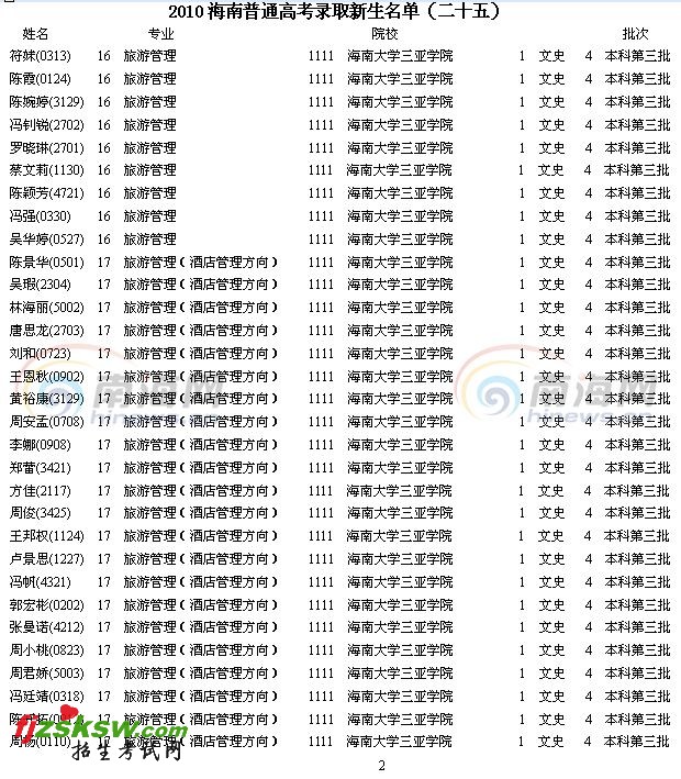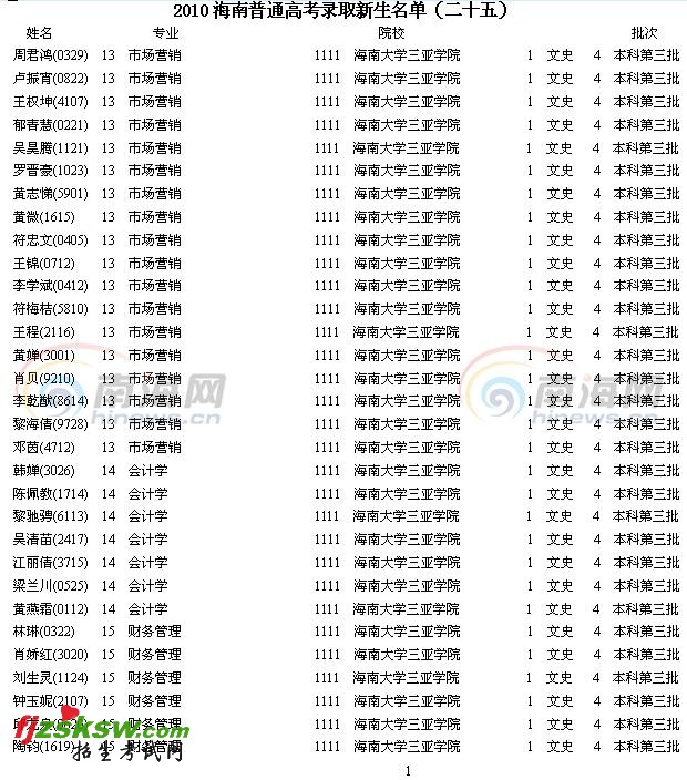 南海网8月9日消息:2010年海南省高考录取名单已经开始由海南省考试局陆续公布,今天公布的是2010年海南省普通高考录取新生名单(二十五)。详情请点进南海网2010高考专题,即可查询。