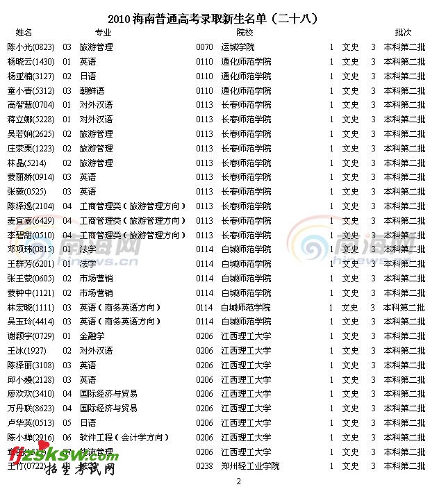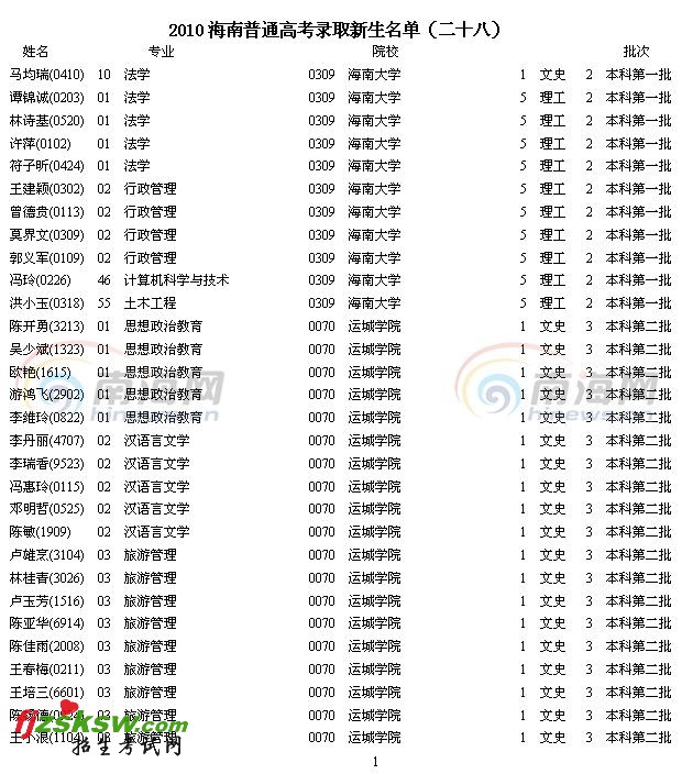 南海网8月14日消息:2010年海南省高考录取名单已经开始由海南省考试局陆续公布,今天公布的是2010年海南省普通高考录取新生名单(28)。详情请点进南海网2010高考专题,即可查询。