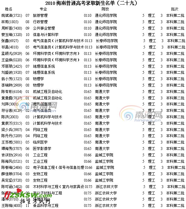南海网8月17日消息:2010年海南省高考录取名单已经开始由海南省考试局陆续公布,今天公布的是2010年海南省普通高考录取新生名单(二十九)。详情请点进南海网2010高考专题,即可查询。