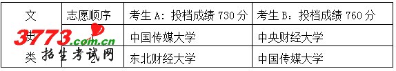 如果按照平行志愿的投档模式,考生B比考生A优先得到投档机会,尽管考生B报考的中央财经大学已投档满额,但录取系统可以再检索考生B填报的下一个志愿中国传媒大学,如果中国传媒大学没有投档满额,考生B的档案也可以投给中国传媒大学,当轮到考生A投档时,如果中国传媒大学已投档满额,这时考生A尽管把中国传媒大学列在志愿的首位,其档案也不能投给中国传媒大学,录取系统只能再检索考生A填报的下一个志愿。