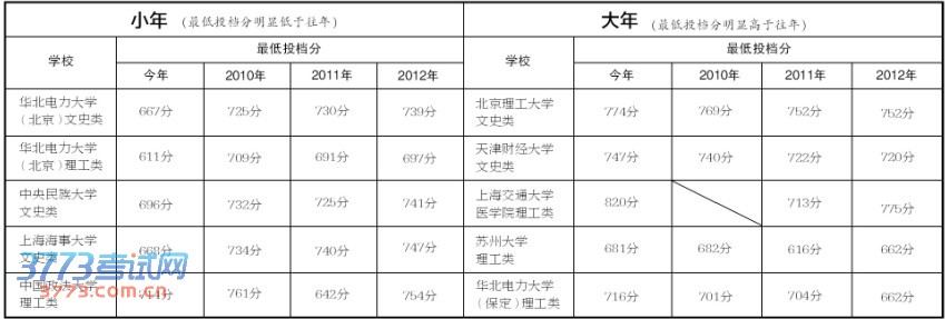 本报海口7月16日讯(记者郭景水)省考试局公布的2013年海南省普通高校招生本科第一批文史类、理工类平行投档分数线显示,部分高校的最低投档分和过去三年的最低投档分相比,有较大的波动,呈现出“大小年”现象,有的高校最低投档分高于往年几十分,有的则是低于往年。