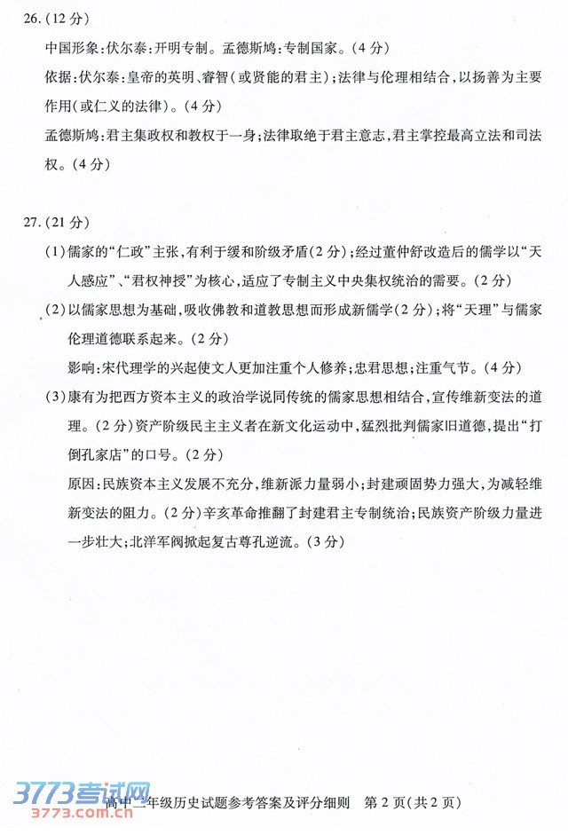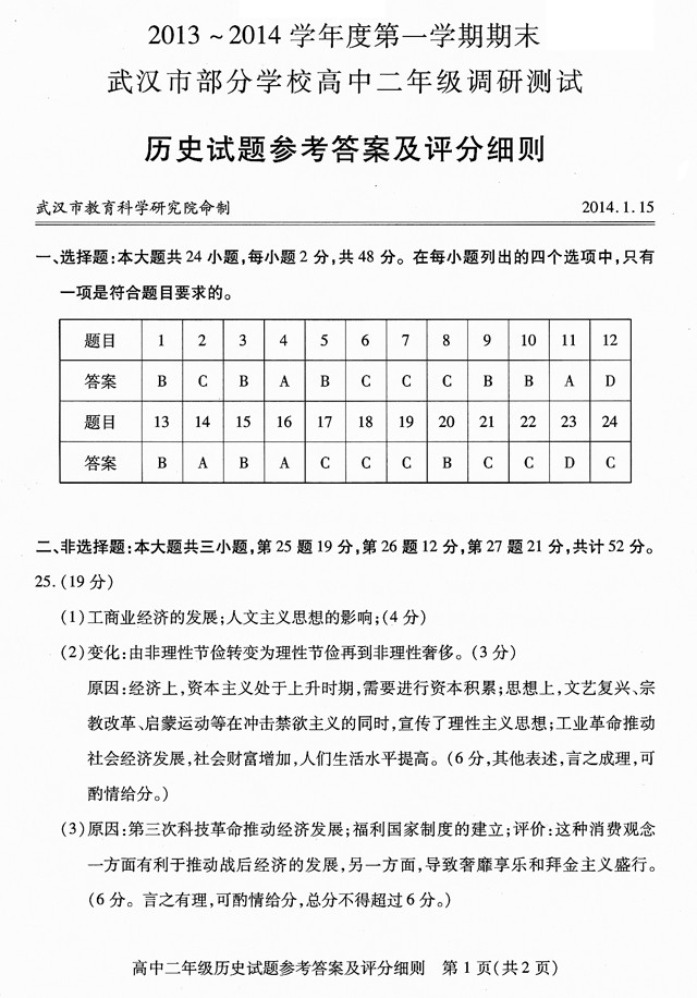 2013~2014学年度第一学期期末武汉市部分学校高中二年级调研测试历史试题参考答案及评分细则