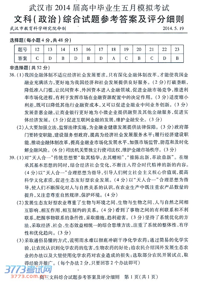 [图文]2014武汉五月模考文综政治试题答案及评分细则
