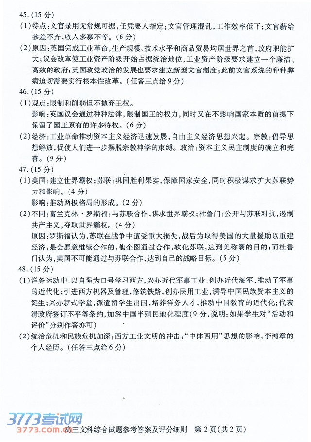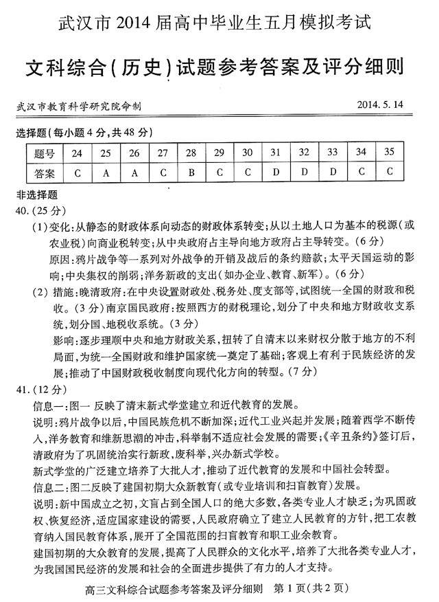 [组图]2014武汉五月调考文综历史试题答案及评分细则