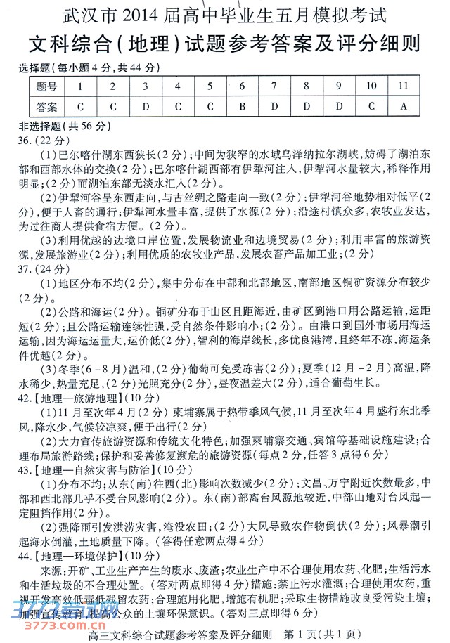 [图文]2014武汉五月模考文综地理试题答案及评分细则