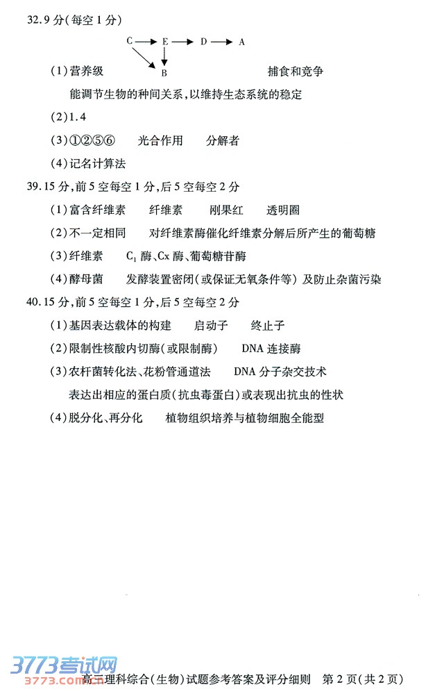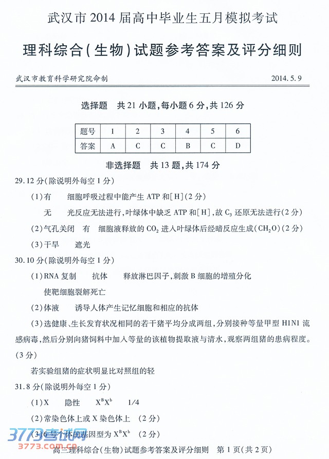 [组图]2014武汉五月模考理综生物试题答案及评分细则