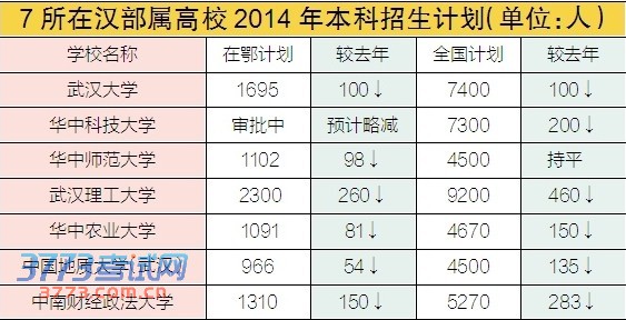 楚天都市报讯 (记者乐毅 罗欣 郭会桥 徐啸寒 廖仕祺 实习生包斯远)本报开辟“加油,高考”专栏后,许多家长考生咨询今年名校招生计划。昨日本报记者多方打探发现,7所在汉部属高校2014年本科招生计划基本确定,除华中科技大学招生计划待教育部审批外,其余6所高校共计划在鄂招生8464人,与去年相比减少743人(详见附表)。不过,省外部属重点高校在鄂招生计划则持平或有所增加。