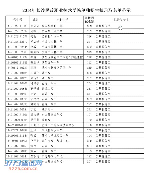 [图文]2014年长沙民政职业技术学院湖北单独招生拟录取名单