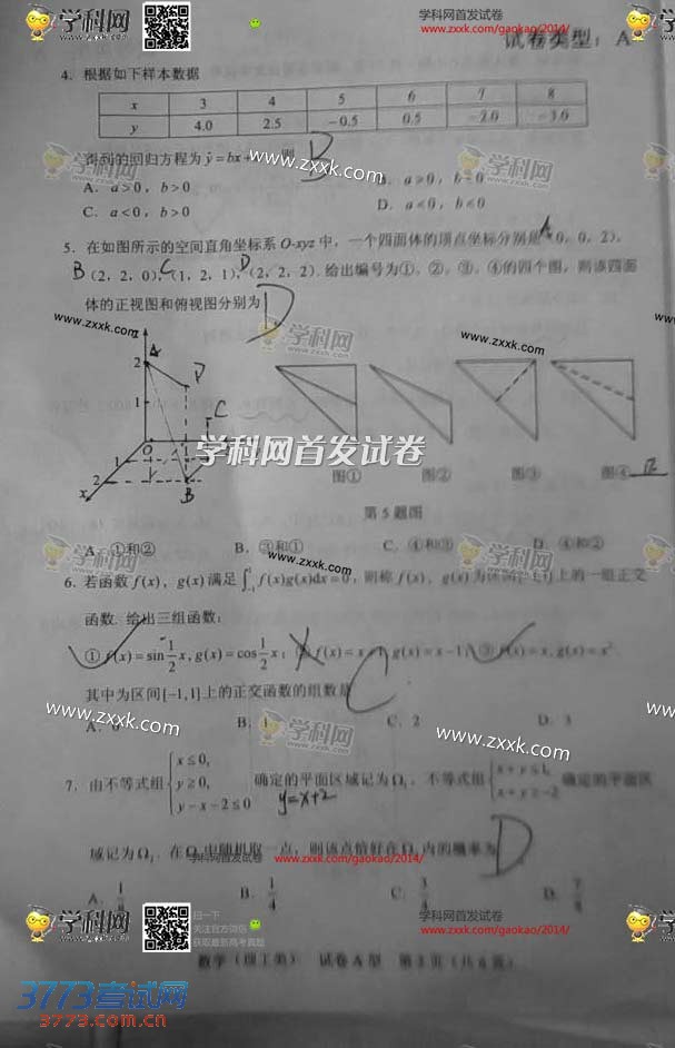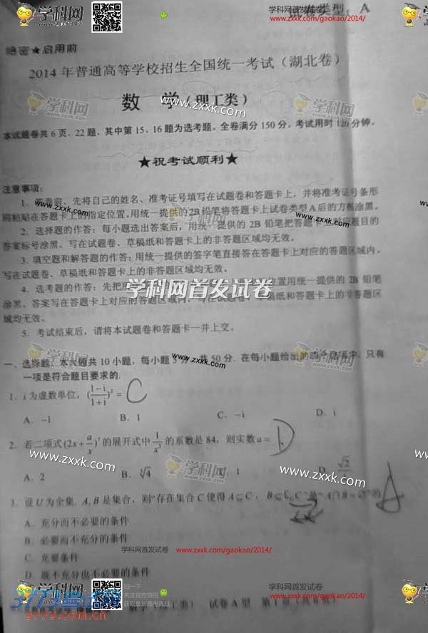 [组图]2014湖北高考数学理科试题及部分答案