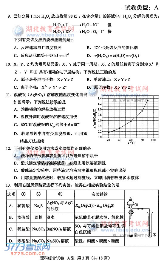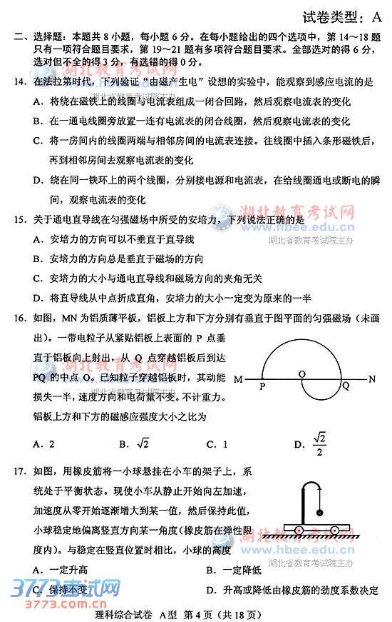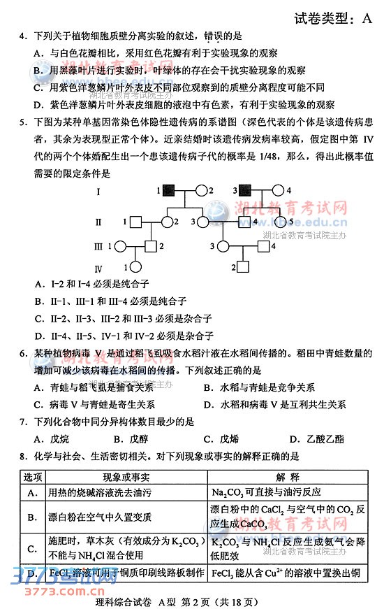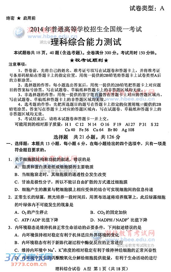 [组图]2014湖北高考理综A卷试题及答案
