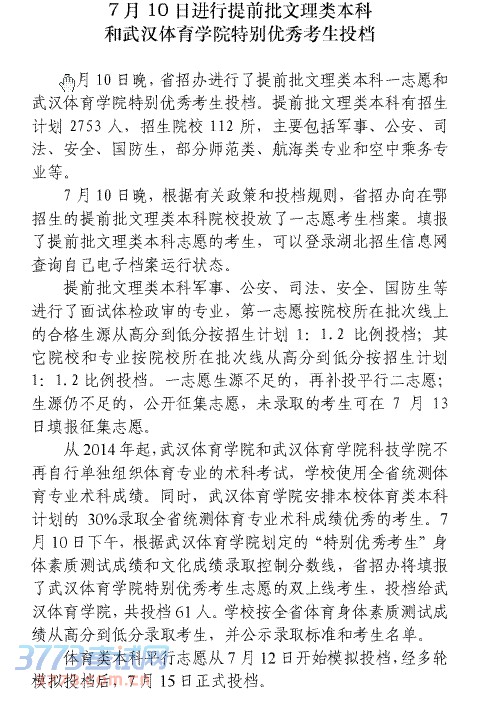 [图文]2014年7月10日湖北提前批本科和武汉体育学院优秀考生投档