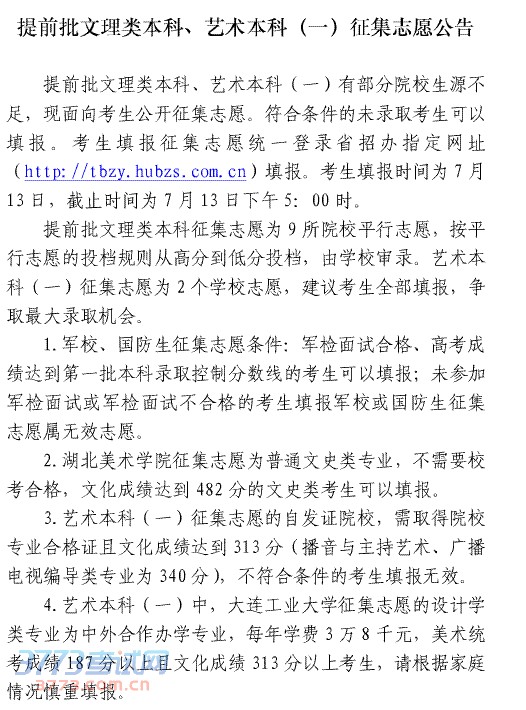 [图文]2014湖北提前批文理类本科艺术本科一征集志愿公告