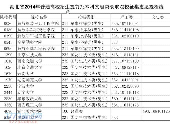 湖北省2014年普通高校招生提前批本科文理类录取院校征集志愿投档线