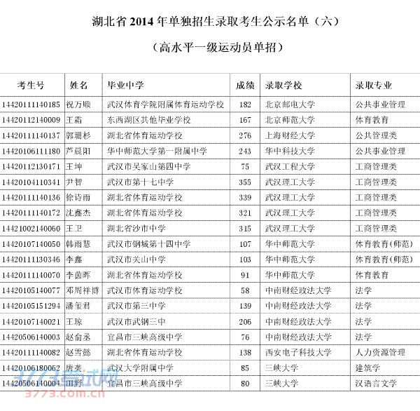 湖北省2014年单独招生录取考生公示名单(六)湖北省2014年单独招生录取考生公示名单(六)