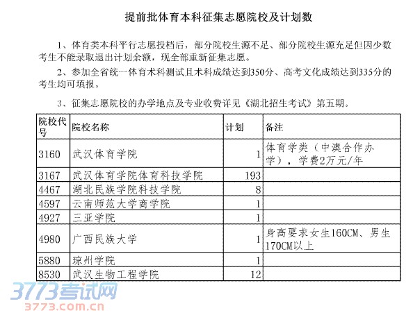 [图文]2014湖北高考提前批体育本科征集志愿院校及计划数