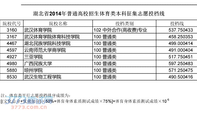湖北省2014年普通高校招生体育类本科征集志愿投档线湖北省2014年普通高校招生体育类本科征集志愿投档线