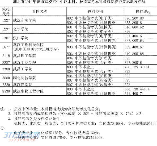 湖北省2014年普通高校招生中职本科、技能高考本科录取院校征集志愿投档线