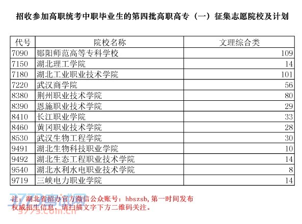 招收参加高职统考中职毕业生的第四批高职高专(一)征集志愿院校及计划