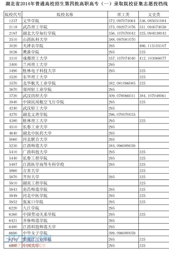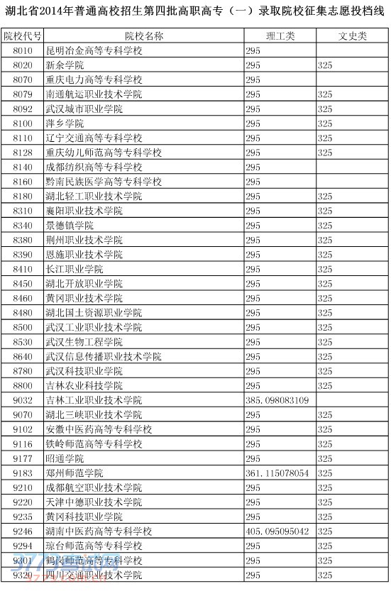 湖北省2014年普通高校招生第四批高职高专(一)录取院校征集志愿投档线