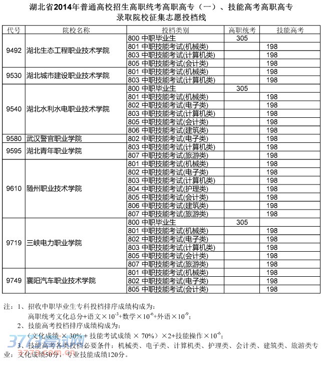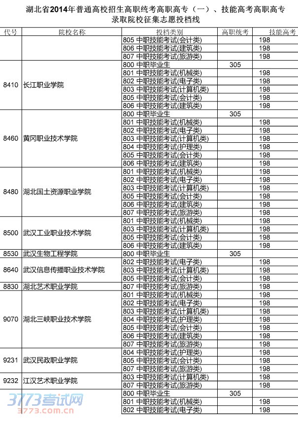 湖北省2014年普通高校招生高职统考高职高专(一)、技能高考高职高专录取院校征集志愿投档线