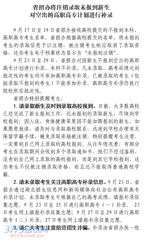 省招办将注销录取未报到新生对空出的高职高专计划进行补录