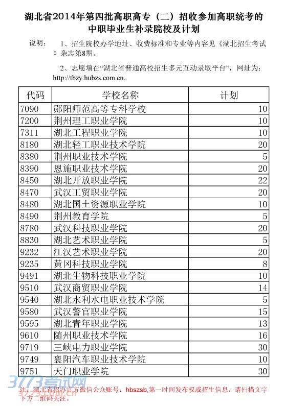 [图文]湖北省2014年第四批高职高专二招收参加高职统考中职生补录院校及计划