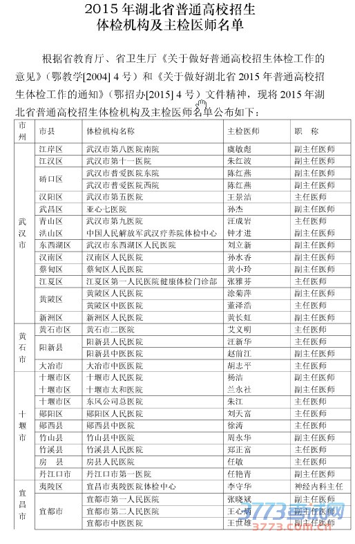 2015年湖北省普通高校招生体检机构及主检医师名单