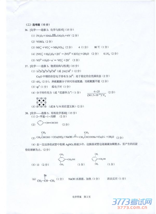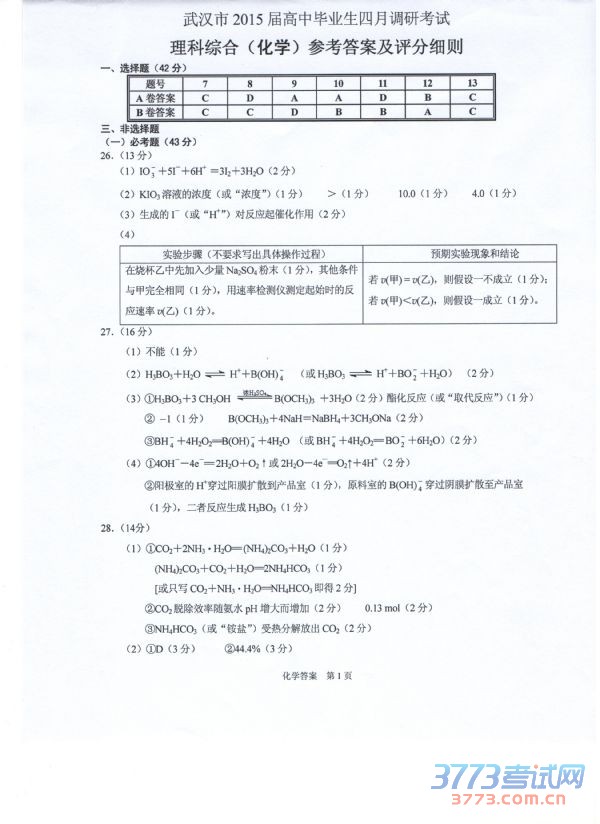 [组图]2015武汉高三四月调考化学答案及评分细则