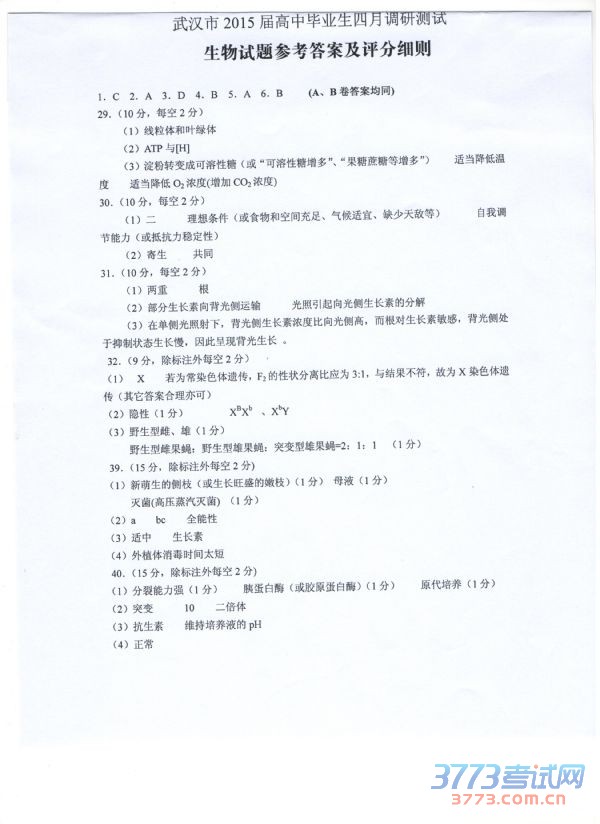[图文]2015届武汉四月调考生物答案及评分细则