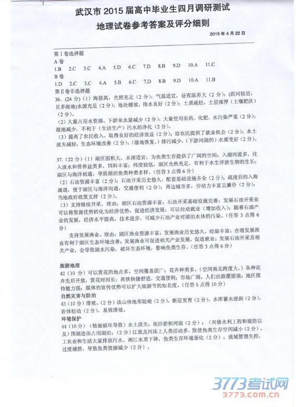 [图文]2015武汉高三四月调考地理答案及评分细则