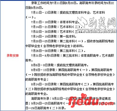 今年,湖北省高校招生分两个时间段进行:7月11日至8月20日为常规录取工作时间,分别进行提前批本科,第一、二、三批本科和提前批高职高专,第四批高职高专录取工作;9月22日至29日为高职高专补录时间,分别对高职高专(一)和高职高专(二)新生不报到空出的招生计划进行补录。