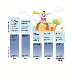 据悉,武大2015年将招生计划继续向重点高校录取率低的11个地区倾斜,继续实施农村学生“自强计划”160名,安排贫困地区专项计划370名,这两类计划所占比例较去年相比均有所提升。同时,两类计划开放了更多招生专业,给学子更多选择。另外,2015年武大还将面向10省份招收4个专业90名国防生,招收100名临床医学和10名口腔医学“5+3一体化培养”学生。