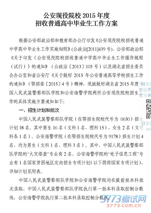 关于印发《公安现役院校2015年度招收普通高中毕业生工作方案》的通知