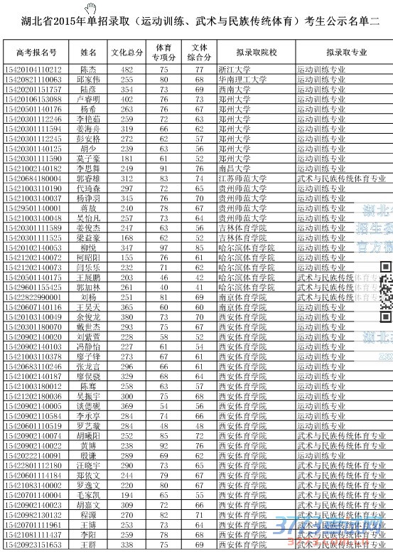 湖北省2015年单招录取(运动训练、武术与民族传统体育)考生公示名单二