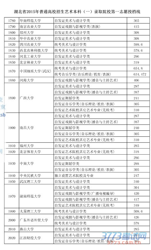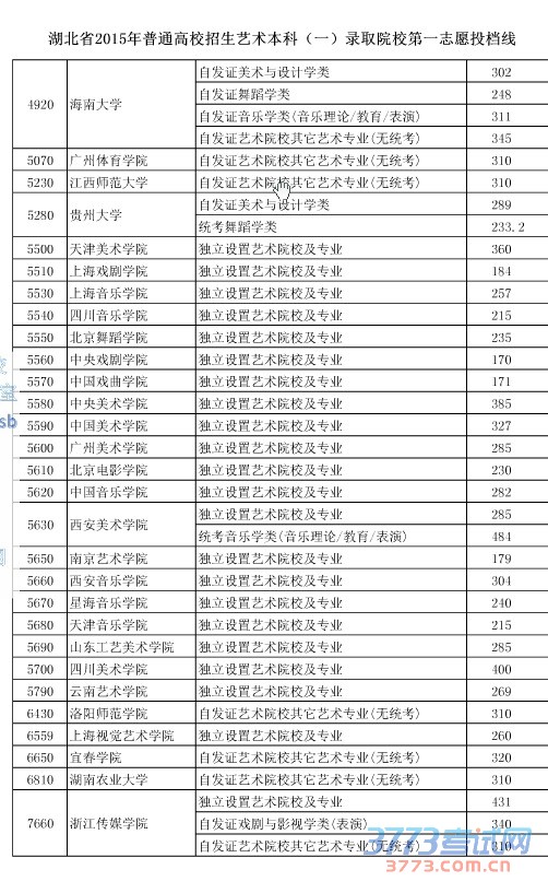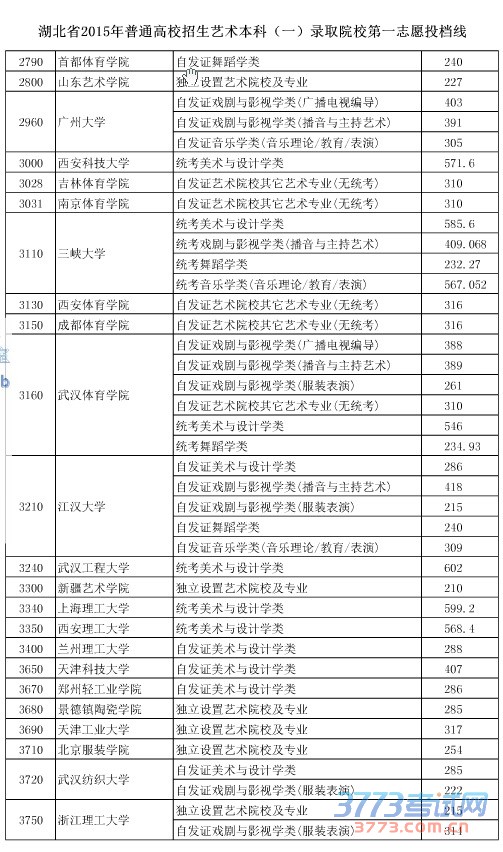 [组图]2015湖北高考艺术本科一院校第一志愿投档分数线