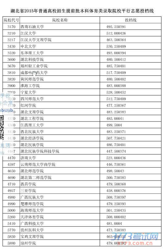 湖北省2015年普通高校招生提前批本科体育类录取院校平行志愿投档线