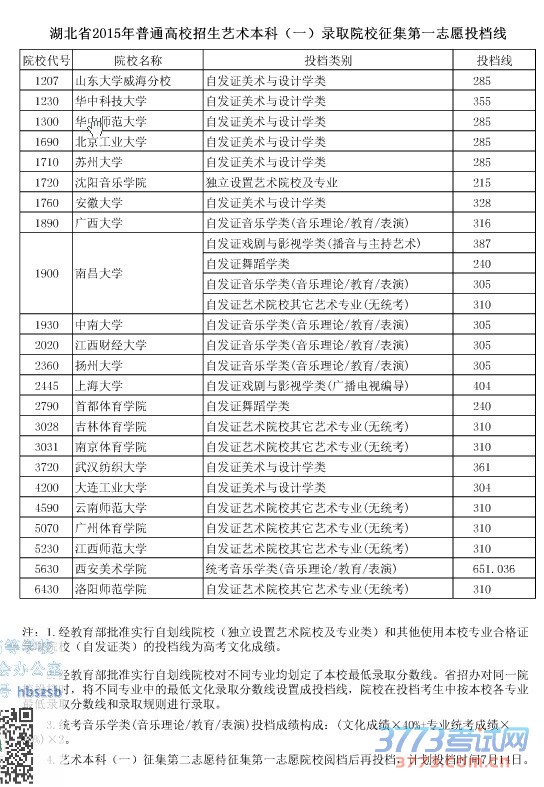 [图文]2015湖北高考艺术本科一院校征集投档分数线