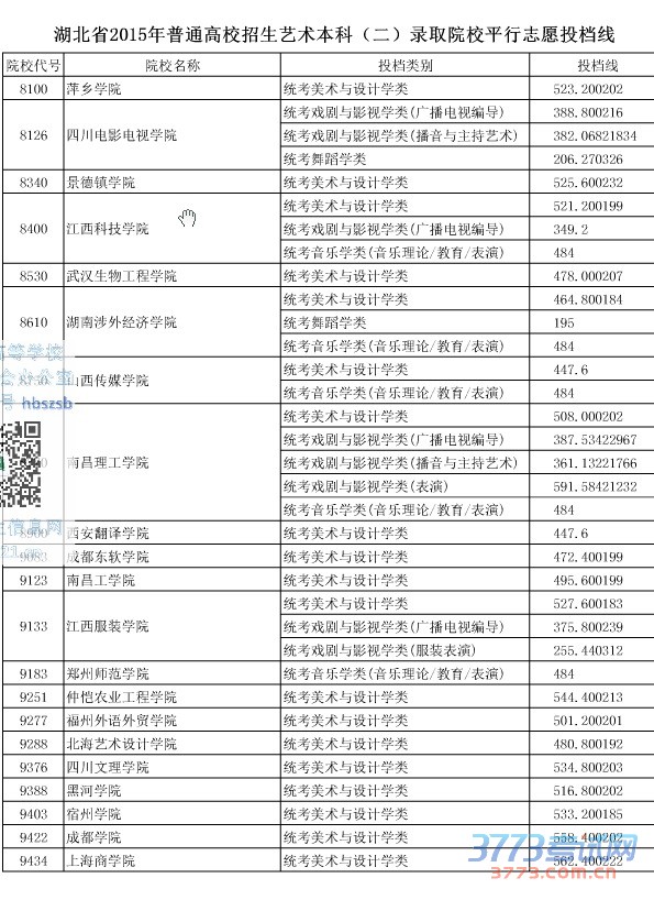 [组图]2015湖北高考艺术本科二录取院校投档分数线