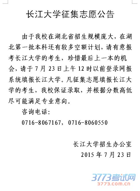 [图文]2015长江大学征集志愿公告(今天中午12点截止)