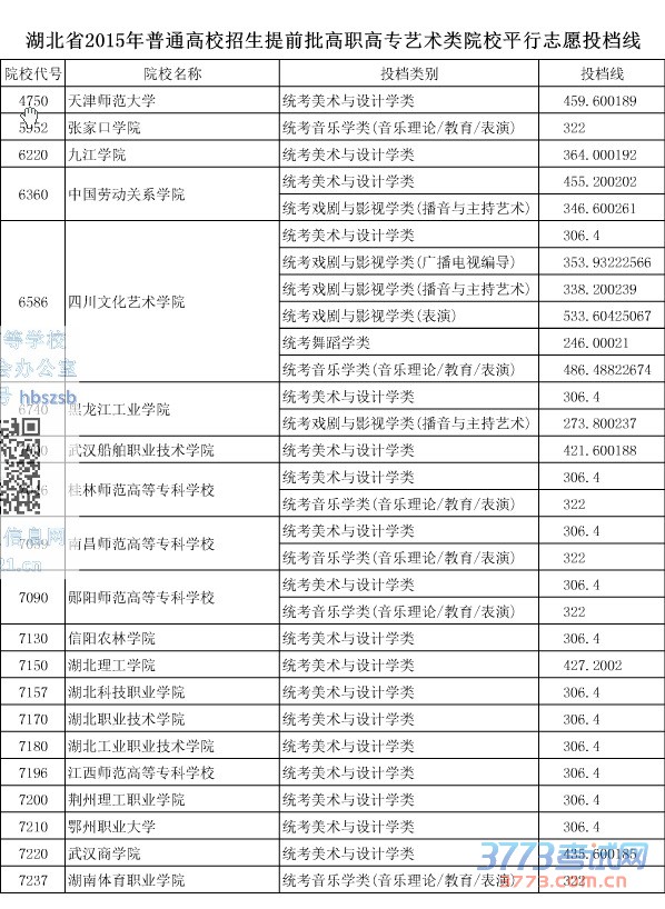 [组图]2015湖北高考提前批大专艺术类院校投档分数线