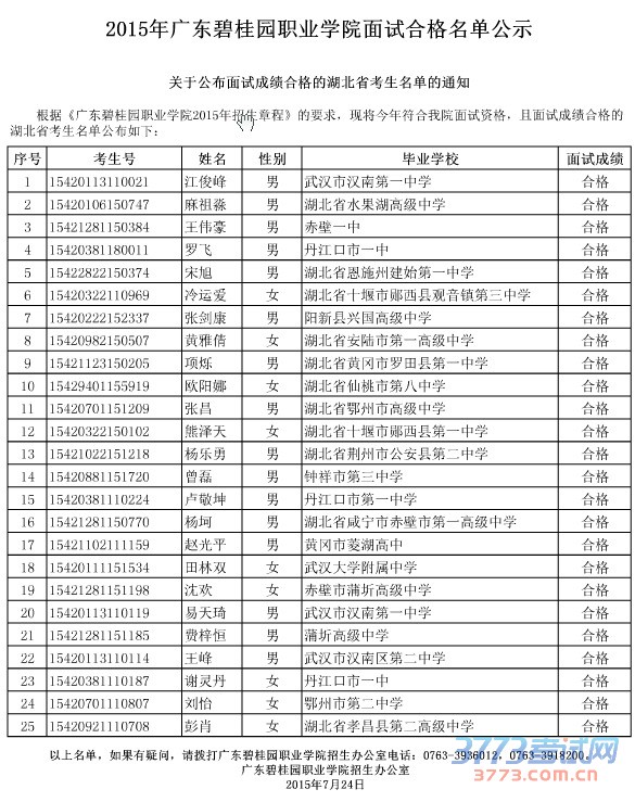 [图文]2015广东碧桂园职业学院湖北面试合格名单公示