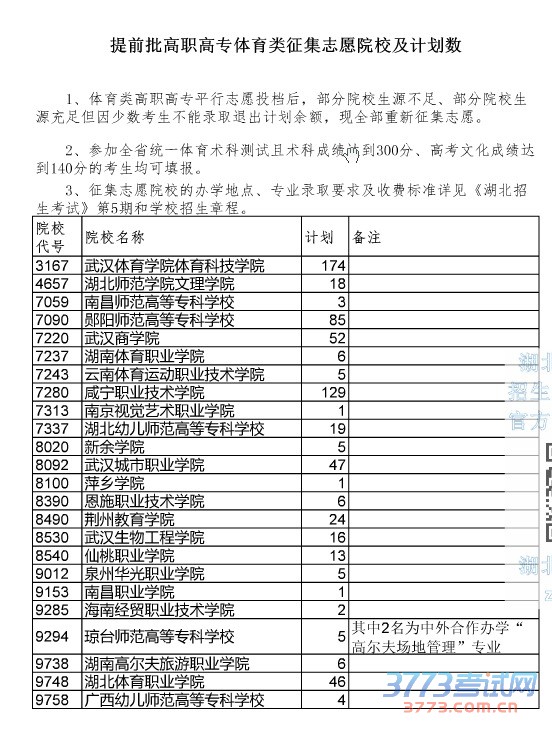 2015年湖北省提前批体育高职高专征集志愿院校及计划数