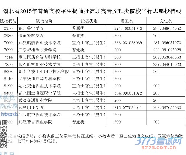 湖北省2015年普通高校招生提前批高职高专文理类院校平行志愿投档线