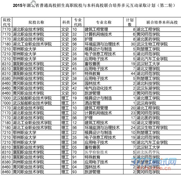 2015年湖北省普通高校招生高职院校与本科高校联合培养多元互动录取计划(第二轮)